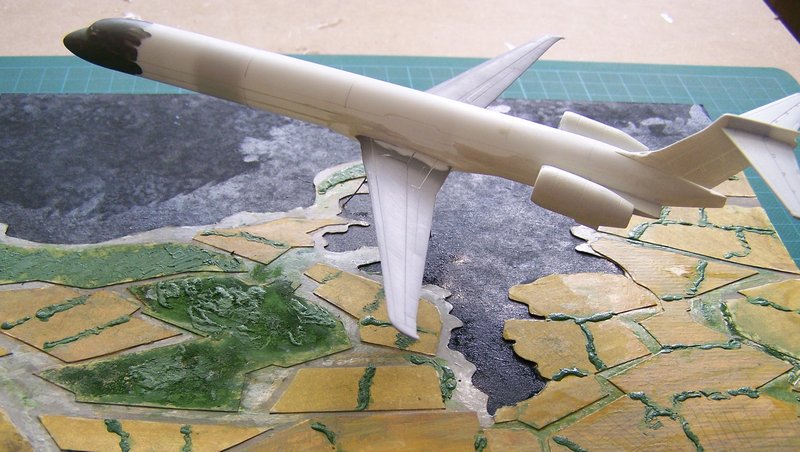 Die Inspiration lag nicht nur im Bau eines Airlinermodells, sondern auch in der Darstellung des gesamten Arrangements drumherum. Es gibt zahlreiche Postkarten und so ist die Wahl auf eine Flugsituation sowie das Landschaftsmotiv gefalllen. Die Vorlage war ein selbst gemachtes Foto während eines Fluges.