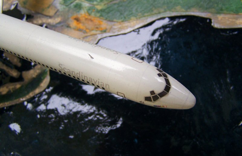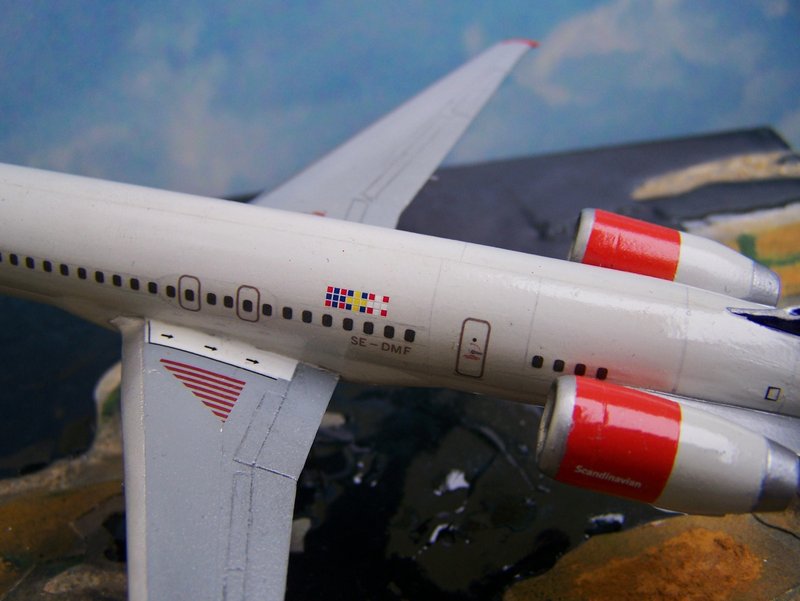 Für das SAS-Grau habe ich die Revell-Farbe 371 verwendet, für die Flügel Revell 374. Die Walkways wurden mit Acryl-Weiß von Tamiya umgesetzt. Das hat den Vorteil, dass die Farbsättigung im Modell so ganz einfach überzeugender wirkt. Die Panell-Lines am Rumpf wurden durch Schablonen aufgebracht und mit dem entsprechenden Farbton fixiert. Der Zusammenbau ist ansonsten wie für Airlinermodelle üblich abgelaufen. Alterungen bzw. Verschmutzungen v.a. an der Rumpfunterseite wurden vorbildgetreu berücksichtigt.