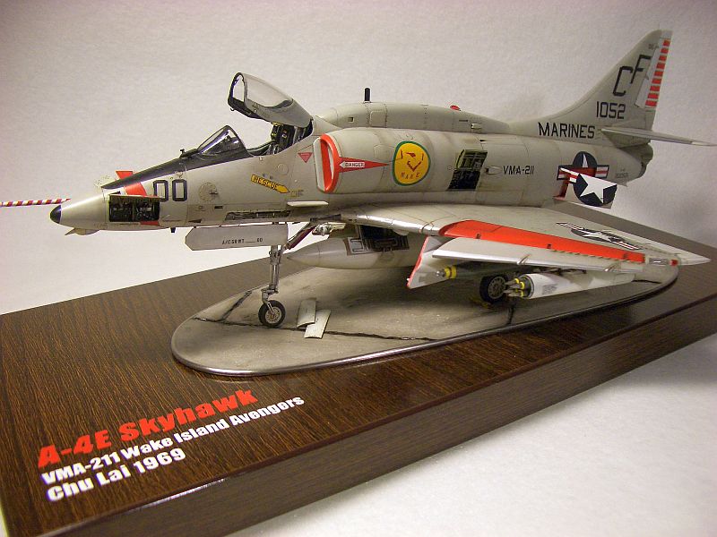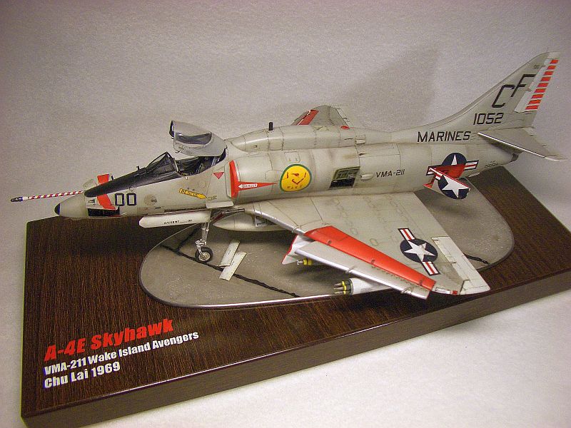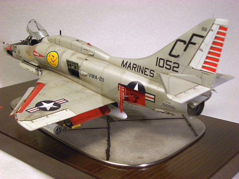 Die Abziehbilder kamen von Fox One Decals und waren sehr schön zu verarbeiten. Ich entschied mich für eine Maschine der VMA-211 "Wake Island Avengers". Eine späte A-4E-Variante, schon mit dem Avionikbuckel auf dem Rumpfrücken, die 1968 in Chu Lai stationiert war.