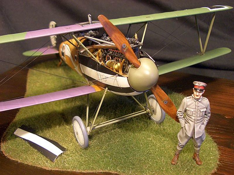 Der Sockel ist eine Maßanfertigung, bestellt bei www.diosockel.com. Ein gelasertes Typenschild aus schwarz eloxiertem Aluminium und eine passende Figur brachten den Abschluss. Bei der Figur, übrigens von Model Cellar, habe ich etwas geschummelt. Eigentlich ist es die Figur von Werner Voss. Diese sieht ihm jedoch so verdammt ähnlich, dass kurzerhand der Kopf von Lothar von Richthofen des gleichen Herstellers herhalten musste. Nun sah die Figur schon etwas "neutraler" aus.
