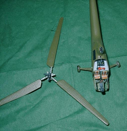Als nächstes montierte ich die Glaskanzel, sie besteht aus insgesamt vier Teilen. Das Besondere an diesem Baukasten ist, dem Bausatz liegt die Kanzel doppelt bei, falls Ihr also bei der Montage ein Problem habt, ist Ersatz vorhanden. Zum Schluss montierte ich die Rotoren. Die Steuerung ist sehr filigran und verlangt sehr viel Geschick beim Einbau in die vorhandenen Bohrungen. Jetzt fehlte nur noch deren Farbgebung. Die Rotoren lackiert man in 1749 "Schwarz" und die Steuerung in 1780 "Stahl".