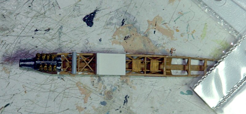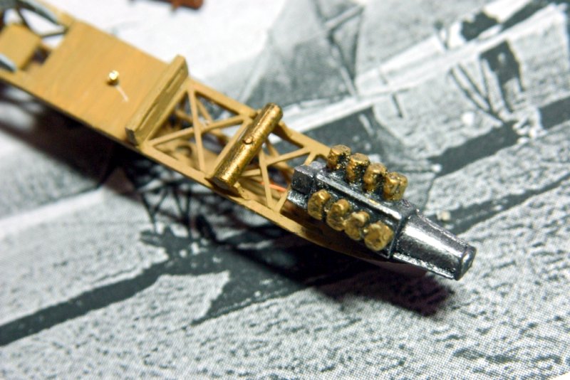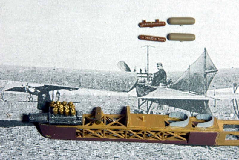 Die Platte zur Aufnahme der Treibstofftanks ist maßstäblich und hat ein Loch zur Aufnahme des Spannmastes. Sie ist jedoch etwas grob geraten. Da ich auch einen etwas dünneren Mast setzen wollte, habe ich eine neue Platte aus 0,3mm Plastik eingezogen. Darauf wurde im vorderen Bereich ein Querbalken aus Plastik gesetzt und entsprechend Vorbildphotos zwei Schlitze eingefräst.