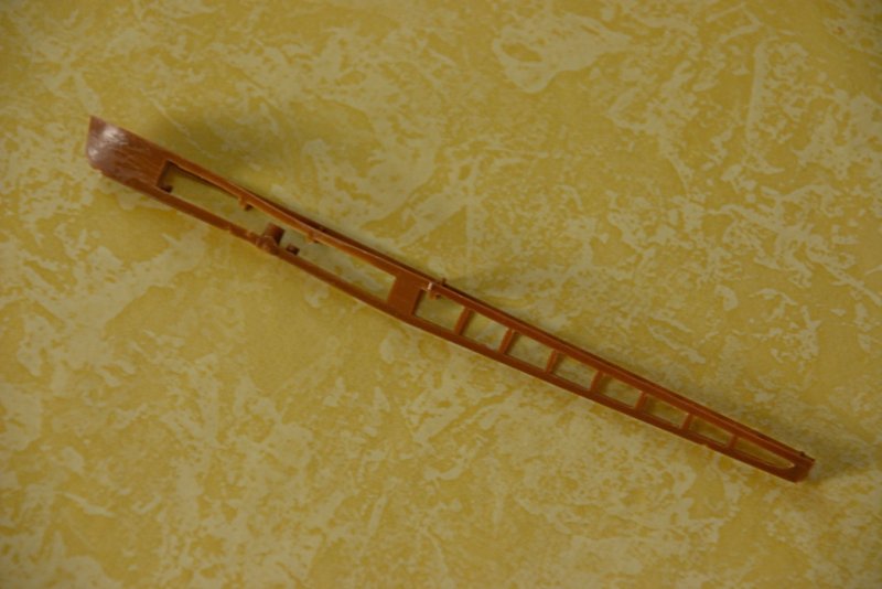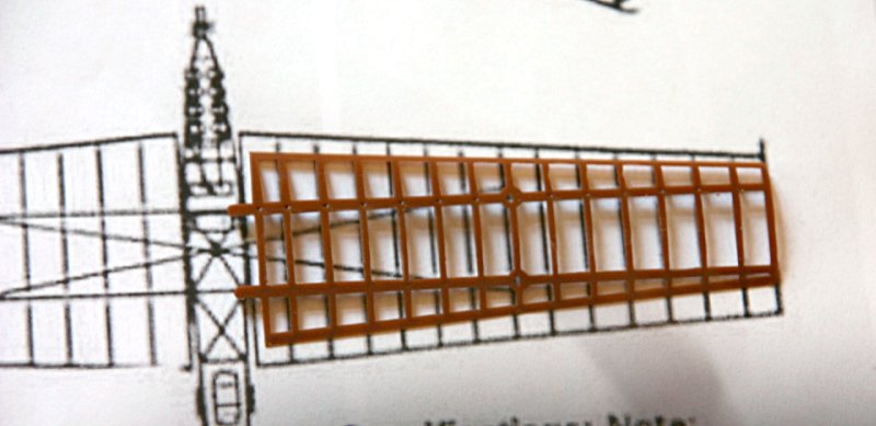 Die Gitterstruktur des offenen Rumpfteiles wurde komplett aus Evergreen- Streifen 0,5 mm aufgebaut und ocker gestrichen. Der obere Gitterträger des Bausatzes für den hinteren Bereich wurde nicht eingesetzt, sondern Plastikstreifen 1mm eingezogen. Dadurch konnte die maßstäbliche, geringere Höhe erreicht werden.