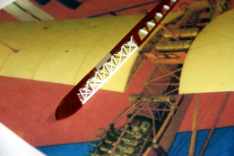 Die Tragflächen sind recht gut gelungen, sie weisen die leicht eingesunkene Struktur vieler Flugzeuge aus der Zeit des ersten Weltkrieges auf. Aber bei Vergleichen mit den Bildern aus Le Bourget zeigte sich, dass gerade bei der Antoinette die Bespannung gerade wie ein Brett ausgeführt wurde. Deshalb habe ich mir die Mühe gemacht, das Seidenpapier abzuschleifen und die Rippen mit dünnem Plastikmaterial aus dem Hobby- Kreativ- Laden zu beplanken. Die Flügel entsprechen dadurch viel eher dem Original.