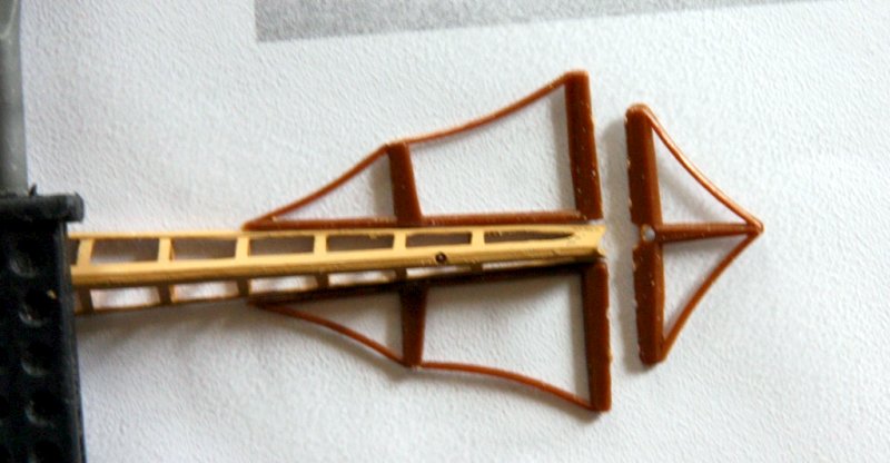 Die neuen Leitwerke und Ruder erhielten Streben aus gezogenen Gussästen, welche mit einer Feile auf Halbrund getrimmt wurden. Diese habe ich dann auf dünne Platten geklebt, die nach dem Dreiseitenriss zugeschnitten wurden. Das Ergebnis ist um Längen besser als die Bausatzteile.