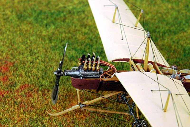 Der Motor wurde komplett neu gebaut. Die Basis bildete eine Bombe aus der Grabbelkiste. Zylinder und Anbauteile entstanden aus gezogenen Gussrahmen. Der Motor wird dann mit Dreieckswinkeln in den Rumpf eingesetzt. Dabei ist zu beachten, dass die Rumpfspitze mit etwas Gefälle angeschliffen werden muss. Das entspricht auch der Antoinette in Le Bourget. Dadurch kann der Motor parallel zur Flugzeuglängsachse eingebaut werden. Die dem Bausatz beiliegende, dicke Trägerplatte wanderte in die Grabbelkiste.