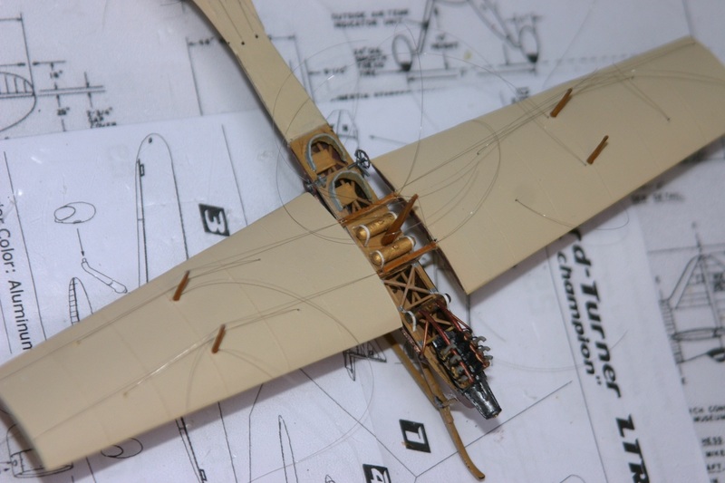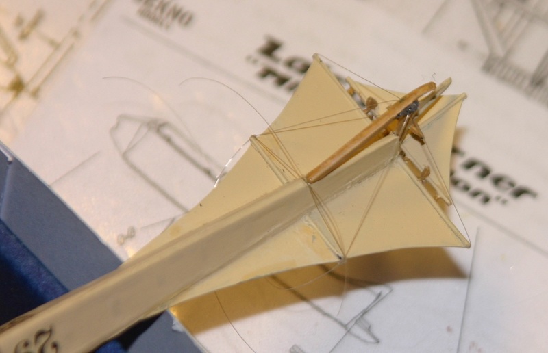 Die Verspannung erfolgte, wie bei meiner Voisin, mit transparentem Garn. Dabei habe ich die Fäden in kleine Löcher am Rumpf geklebt und über die Spanntürme gezogen. Das Ende wurde wieder zurück zur Tragfläche geführt und mit Maskierband provisorisch befestigt. Nachdem ich immer die gegenüberliegenden Drähte so vorbereitet hatte, wurden sie mit einem Tropfen Sekundkleber am Turm fixiert. Als der Leim trocken war, brauchten nur noch die Enden gelöst und abgeschnitten werden. Nach kompletter Montage erhielten die Spanntürme noch etwas silberne Farbe als Beschläge.