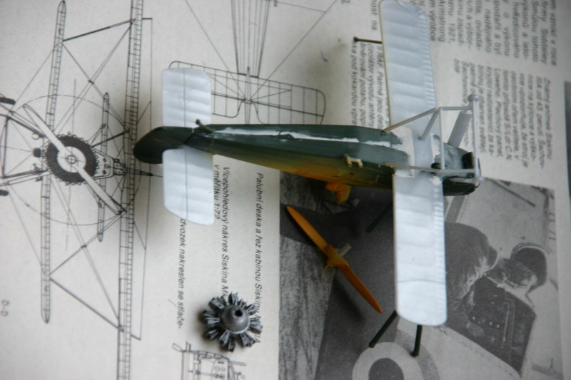 Als nächster schritt wurden die Tragflächenstiele und das Fahrwerk montiert. Die Teile sind von ausreichender Qualität, so dass nur die Nahtstellen der Gussform und Angüsse verputzt werden müssen. Gleiches gilt auch für Motor und Auspuffsystem, welche jedoch separat gestrichen und nach der Lackierung des Rumpfes angebracht wurden.