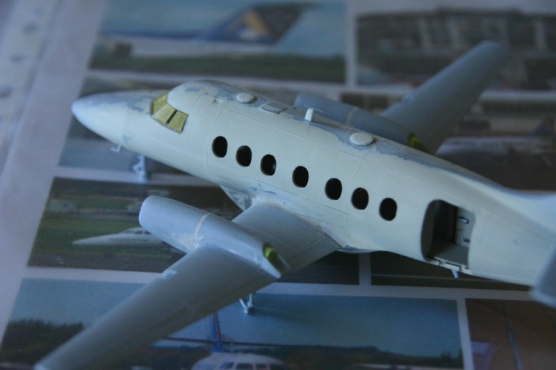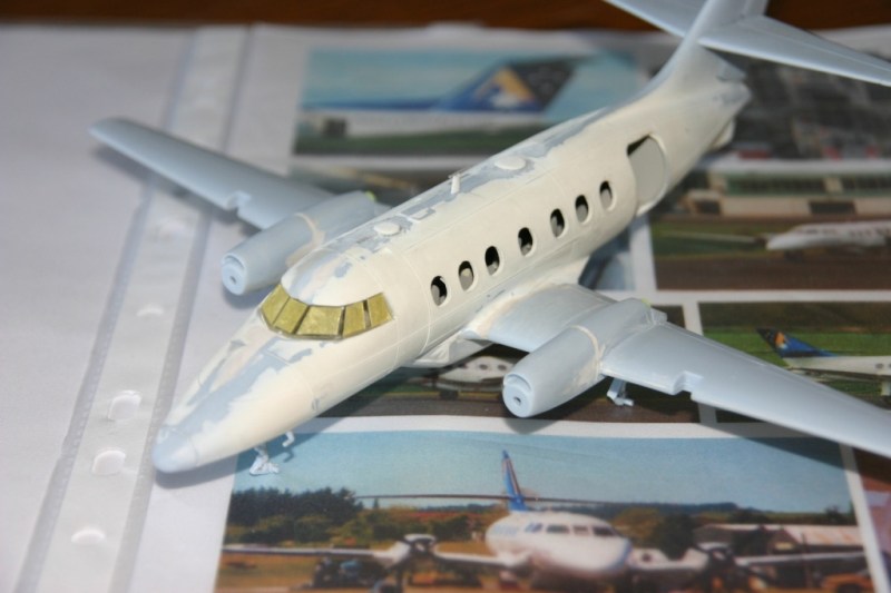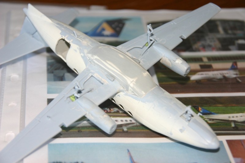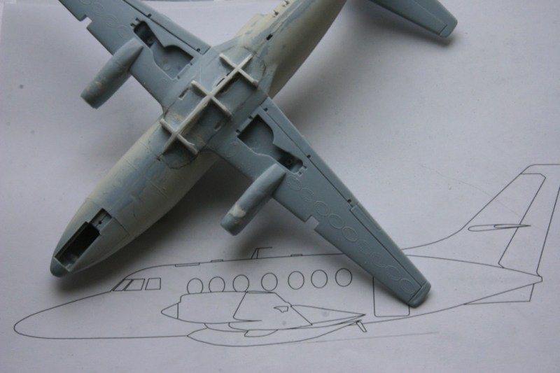 Im Bausatz ist eine amerikanische Maschine enthalten. Diese wurde mit einer Sanitätsausstattung versehen, erhielt eine zweiflüglige Ladetür und amerikanische Triebwerke. Da ich jedoch eine zivile Jetstream bauen wollte, standen mir umfangreiche Änderungen bevor.