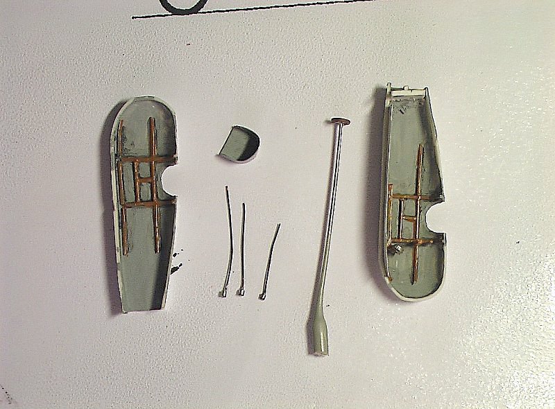 Nachteilig bei allen Vaku- Bausätzen ist, dass Tragflächen und Leitwerke nur auf einer Seite ein Profil haben. Ich habe deshalb auf der Rückseite die Ruder nachgraviert und bei einem Seitenleitwerk die Rippenstruktur durch aufkleben von transparentem Nähgarn mit Sekundenkleber imitiert. Danach habe ich mich erst einmal dem Rumpf gewidmet.