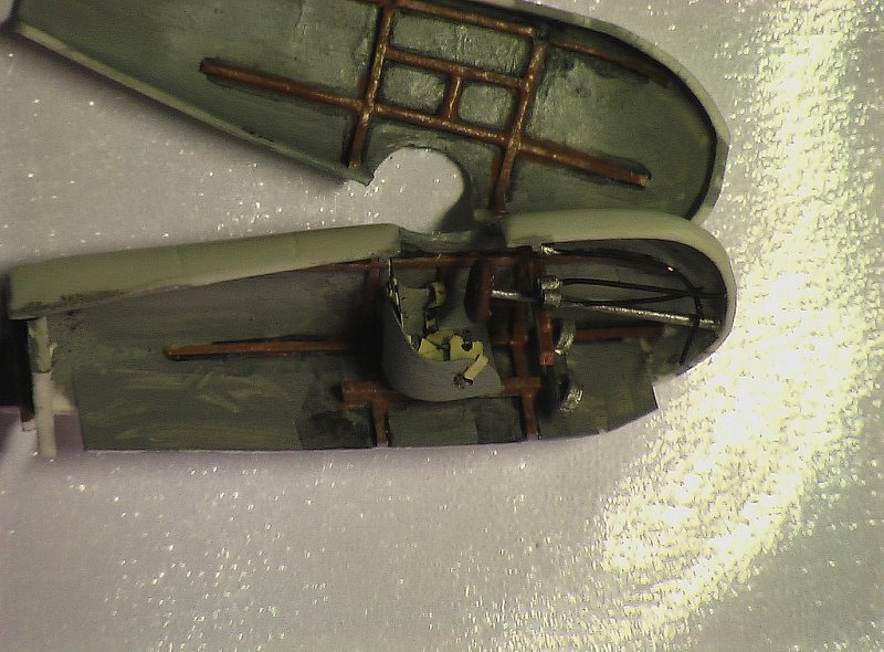 Ich besitze ein Bild, was den Bau einer Replik in noch unbespanntem Zustand, leider ohne Inneneinrichtung zeigt. Daher ließ sich die Lage der Rumpfverstrebungen recht gut feststellen. Ich habe sie aus Evergreenstreifen nachgebildet. Über die Ausrüstung konnte ich nur Vermutungen anstellen. Da die Blackburn Monoplane mit einem Lenkrad ausgestattet war, halte ich es für wahrscheinlich dass es bei der Triplane auch so war. Mein Modell erhielt also ein solches, dazu noch drei einzeln an einer Strebe angebrachte Instrumente und die Fußpedale einer Sopwith Camel. Der Sitz und die Gurte wurden aus verschiedenen Eduard- Platinen entnommen.