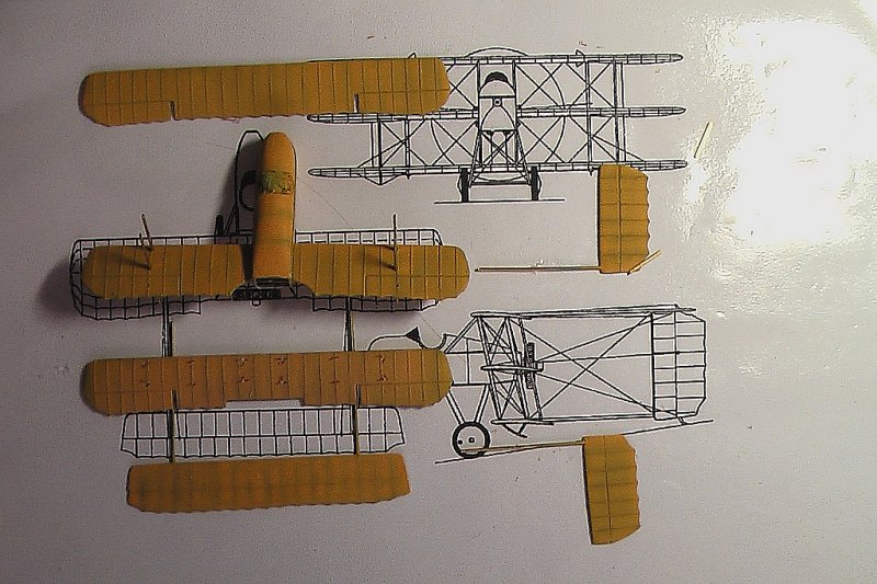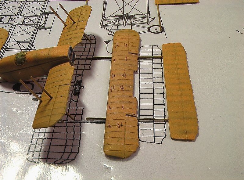 Vor dem Zusammenbau des Hinterrumpfes wurden noch die Tragflächen verspannt. Diese Arbeit nimmt den größten Teil der Bauzeit in Anspruch. Das Model verfügt über mehr als 80 Spann- und Steuerdrähte, wovon die meisten zwischen den Tragflächen sitzen. Ich habe am unteren Ende eine Drahtöse Durchmesser 0,6 mm eingeklebt (um eine Kanüle gewickelt), am oberen Ansetzpunkt einen Faden unsichtbares Garn befestigt, den Faden durch die Öse gefädelt und beim festziehen die Öse langgezogen bzw. mit einer Pinzette etwas nachgeholfen. Ich denke, das Drahtstück geht so als Spannschloss durch.