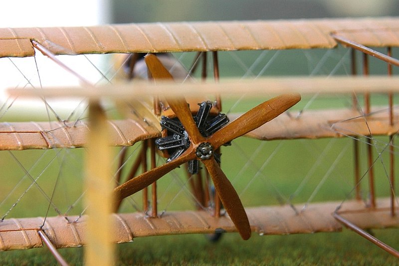 Doch weiter zum Bau. Die Variante mit Vierblattpropeller gefällt mir deutlich besser. Deshalb habe ich einen Propeller von der SE5A genommen und die Blätter etwas verlängert. Der Motor dieser Variante hat auf der Vorderseite zwei Ventilstößel und nicht einen, wie im Bausatz und an der Replik mit Zweiblattpropeller gezeigt. Deshalb wurde er gegen einen aus der Grabbelkiste getauscht (stammt von einer Sopwith Camel). Nach Bemalung wurde die Motor- Propellerbaugruppe mit einer Messingwelle und Hülse montiert.