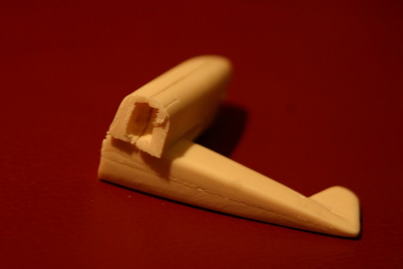 Die Kabine ist nur rudimentär ausgebildet. Der Einblick ist zwar durch das kleine Kabinenloch sowieso schlecht möglich, aber ich wollte den Einstieg offen darstellen, um das Modell zu beleben. Zudem zeigte sich, dass sich der hintere Tragflächenübergang schlecht einpassen lässt. Daher entschloss ich mich, den Rumpf an dieser Stelle zu trennen.
