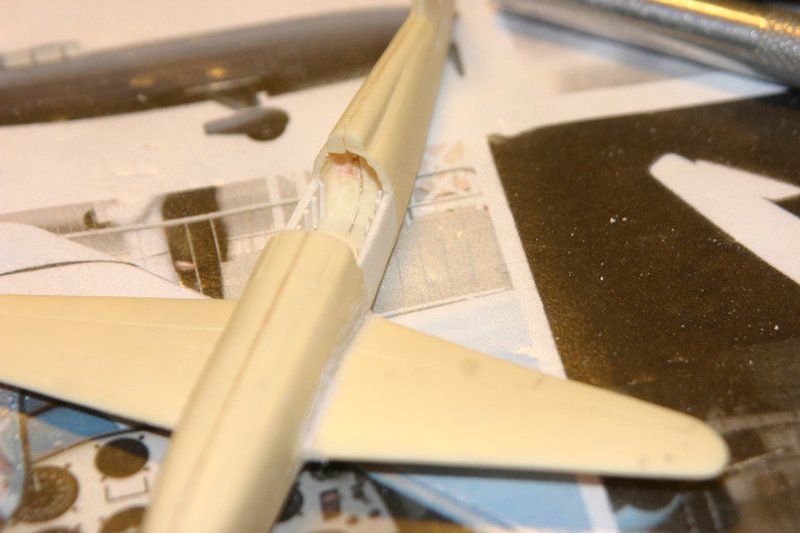 Nun zeigte es sich deutlich, dass die Kabinenwände erheblich zu dick sind. Deshalb habe ich das hintere Rumpfteil im Kabinenbereich komplett ausgeschnitten und neue Seitenwände aufgebaut. Das Armaturenbrett, der Steuerknüppel und die Fußpedale wurden neu angefertigt. Ein neuer Sitz wurde der Grabbelkiste entnommen. (könnte von einer Po-2 gewesen sein.)