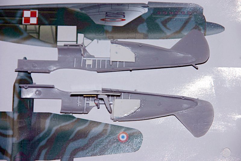 Die Haube wurde in vier Teile zerlegt und alle neu aus durchsichtigem Plastik gezogen. Diese Arbeit war sehr zeitintensiv, ließ sich aber nicht vermeiden, da das dicke Originalteil sich aufgrund der Einbauten nicht montieren ließ. Obwohl ich nicht sicher bin, dass die Haube nach rechts zu öffnen war – ich habe nur vage Anhaltspunkte an kleineren Bildern – habe ich der Einfachheit halber die Kabine offen dargestellt.