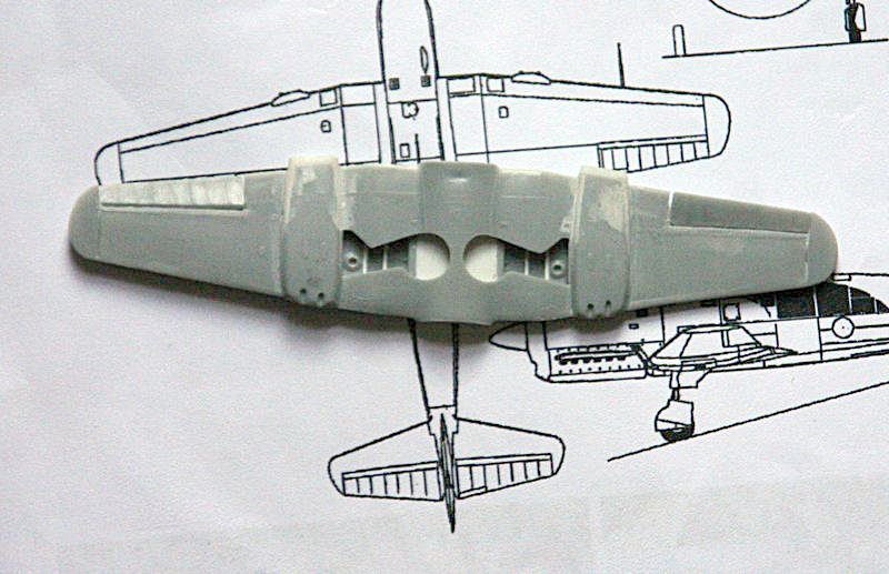 Die Passgenauigkeit ist einigermaßen annehmbar, obwohl man ohne Spachtel- und Schleifarbeiten nicht auskommt. Insbesondere der Tragflächenübergang und die Ansatzflächen der Höhenleit-werke bedürfen etwas härterer Nacharbeit.