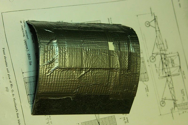 Entgegen meiner bisherigen Bauweise habe ich mich entschieden, diesmal mit dem Bau der Leitwerke und Tragflächen zu beginnen. Den Anfang machten das Höhenleitwerk und die Höhenruder. Ich habe mir dazu aus einem Stahlblech eine Form gebogen, die eine ungleichmäßige Wölbung hat. Danach wurde eine 1mm dicke Plastikplatte mit Klebeband auf die Form geklebt und das Ganze in kochendem Wasser erhitzt. Nach der Abkühlung hat die Plastikplatte die passende Wölbung angenommen.