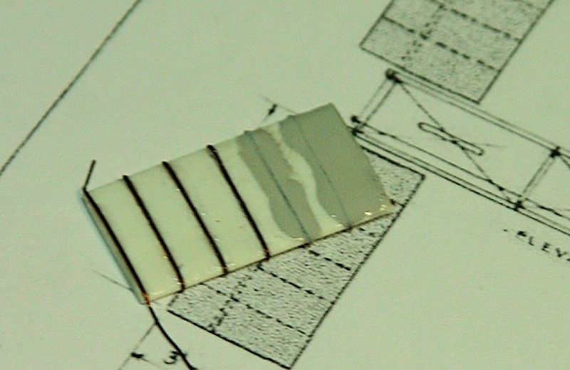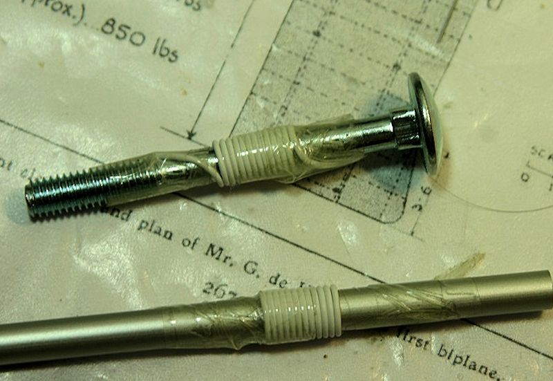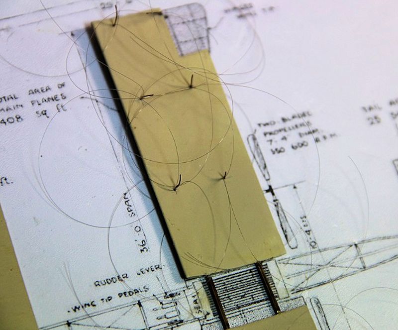 Das Rumpfmittelteil war bei der D.H. No.1 mit Metallbeschlägen verstärkt. Sie sehen auf einem Bild der abgestürzten Maschine aus, als wären sie im Nachgang angeschraubt worden. Ich habe deshalb dünne Winkel aus meinem Aktentrennblatt herausgetrennt und auf die Längsträger geklebt. Danach wurden die Ränder verschliffen und für die Nachbildung der Schrauben einige Löcher mit einem Bohrer 0,3mm gebohrt. In die Löcher wurde der Draht meiner Spule eingeklebt und der Überstand mit einem Seitenschneider eingekürzt. Auf gleiche Weise verfuhr ich auch mit den anderen Beschlägen am Rumpf.