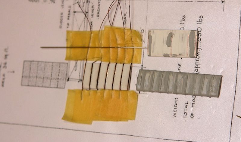 Danach ging es an die Montage des Fahrgestells. Ich habe es aus 0,8mm Messingprofil aufgebaut, welches mit 0,5mm Löchern durchbohrt wurde. Danach wurden die Teile verstiftet. Auch wenn nirgendwo ersichtlich, glaube ich, dass das Hauptfahrwerk durch Spiralfedern abgefedert wurde - ähnlich der damals weit verbreiteten Voisin Doppeldecker. Ich habe deshalb aus Spulendraht eine Feder gebogen und am oberen Hauptahrwerksausleger angebracht. Dabei muss beachtet werden, dass er am oberen Holm nicht gelagert gewesen sein kann ohne die Bewegung zu behindern, denn durch die Fahrwerksstreben muss er geringfügig schwingen können.