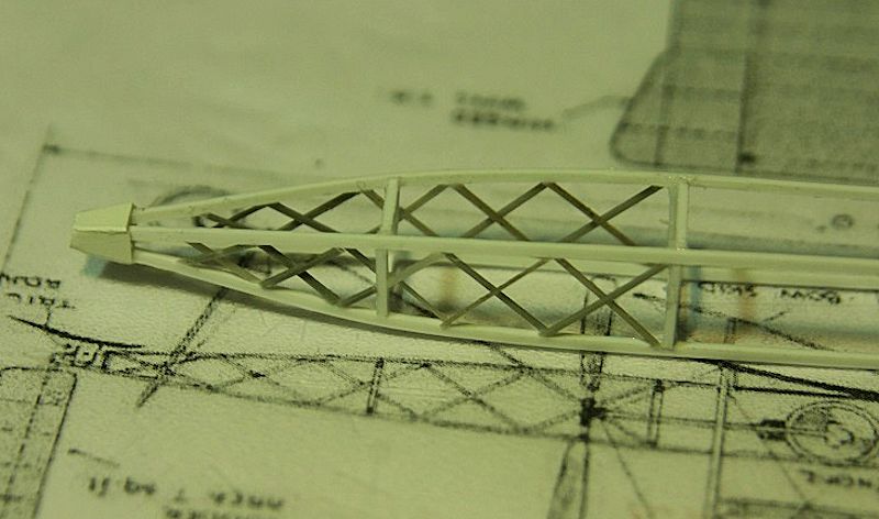 Im nächsten Schritt entstanden die Rumpflängsseiten. Die Längsholme und die Querstreben wurden aus 0,8mm Rechteckprofil gefertigt. Die Gitterstruktur bestand beim Original aus dünnen, flachen Holzleisten. Zur Nachbildung habe ich einen Gußast flach geschliffen, über einer Kerze erwärmt und lang gezogen. Die dabei erhaltenen Fäden hatten ein flaches Profil und ließen sich als Verstrebungen ausgezeichnet einsetzen.