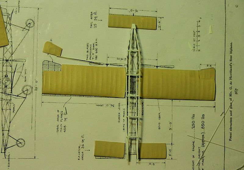 Zum Modell: In meiner Bastelstube lümmeln sich seit längerer Zeit verschiedene Renwalbausätze herum. Ich entschied mich zum Bau der De Havilland No.1. Zu diesem Typ gibt es offensichtlich nur ein Bild im unversehrten Zustand aber eine recht gute Beschreibung in der Zeitschrift Flight Global. (unter www.flightglobal.com) Dort ist auch ein Riss enthalten, der offensichtlich recht stimmig ist. Riss und Bild stimmen gut überein und zeigten mir, dass der Bausatz von Renwal viele Fehler aufweist. Da die Plastikteile zudem recht grob sind, entschied ich mich dazu, das Modell scratch zu bauen.