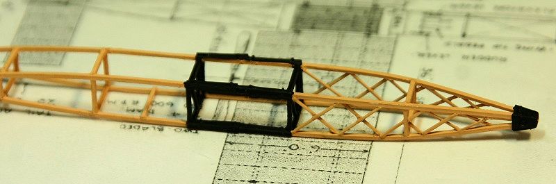 Im folgenden Arbeitsschritt wurde der Rumpf fertig gebaut, der Sitz bemalt und eingebaut. Die offenen Rumpfsegmente erhielten eine Verspannung aus transparentem Garn. Beim Original wurden die Enden der Drähte durch Metallbeschläge an den Holmen gehalten. Ich habe deshalb die Spannseile außen auf den Rumpf geleimt und als Beschlag kleine, silbern angemalte Plastikstücke drüber geklebt. Abschließend wurden noch kleine Stücke eines gezogenen Gußastes als Schraubenköpfe angebracht.