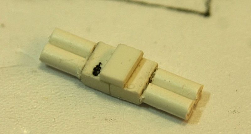 Dann interpretierte ich den Kühler, von dem es kein deutliches Foto gibt. Ich habe zuerst versucht einen Kühler mit Kühlrippen herzustellen. Nach mehreren Fehlversuchen entschied ich mich für einen einfachen Rohrschlangenkühler. Dazu wurden Haare einer Bürste mit Sekundenkleber in gleichmäßigem Abstand auf zwei Rechteckholme 0,5mm geklebt. Nachdem alles trocken war, habe ich die Ränder beschnitten und die Längsseiten mit einem dünnen Evergreenprofil als Rahmen begrenzt. An den Stirnseiten kam dazu ein Winkel aus meinem bewährten Aktentrennblatt zum Einsatz. Zuletzt wurde noch ein Einfüllstutzen aus gezogenem Gußast auf der Oberseite aufgeklebt.