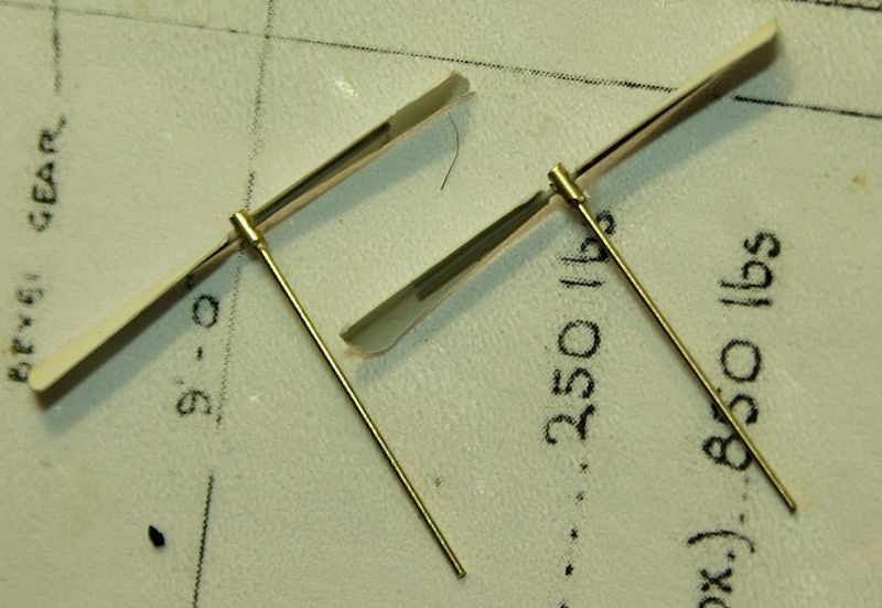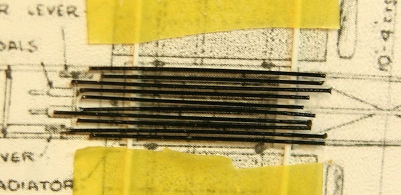 Auf dem mir bekannten Foto sieht es aus, als ob die äußeren Tragflächenstreben etwas dünner als die inneren wären. Ich habe sie deshalb aus 0,5 mm Messingrohr angefertigt. Dabei kam mir zu Gute, dass ich mir vor Jahren ein Proxxon Kappgerät gekauft habe. Dadurch konnte ich alle 12 Streben auf Anhieb in der gleichen Länge schneiden. Anschließend mussten nur noch die Grate verschliffen werden und die Streben konnten ihre Lackierung erhalten. Ich habe sie auf die gleiche Weise wie den Rumpf bemalt.