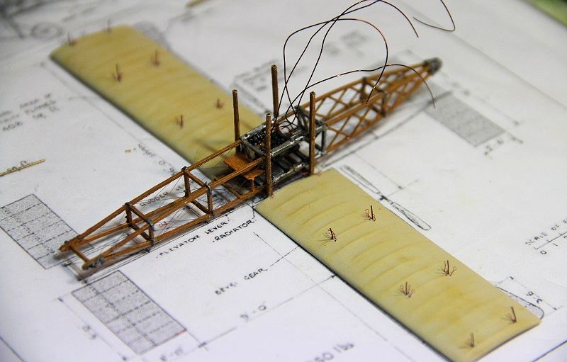 In nächsten Schritt wurden die Tragflächen zur Montage vorbereitet. Da die Streben aus Messingrohr bestehen, können sie bei der Montage verstiftet werden. Dazu habe ich an den Ansatzpunkten der Streben Löcher Durchmesser 0,3mm gebohrt. An der oberen Tragfläche wurden transparente Garnfäden als Spanndrähte und ein Stift aus Spulendraht (ca. 0,2mm) eingeklebt. Unten erfolgte nur die Verklebung eines Stiftes. Um diesen herum wurden 0,3mm Bohrungen gesetzt und kleine Ösen aus 0,1mm Kupferdraht als Spannschloss eingeklebt. Diese habe ich zuvor durch umwickeln einer 0,3mm dicken Kanüle selbst gebogen.