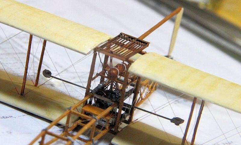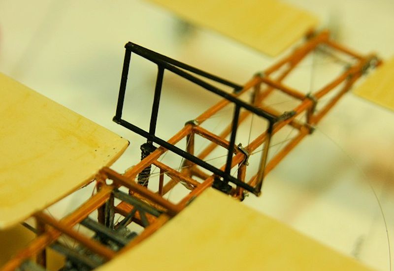 Im nächsten Arbeitsschritt wurden Seitenruder und Höhenleitwerk montiert. Der obere Seitenleitwerksträger entstand wieder aus Messingvierkantprofil. Für das Höhenleitwerk habe ich eine Achse in die Hülse des Rumpfendes eingeführt und zwei Beschläge aus Plastiksheed daran befestigt. Im Anschluss wurde das Leitwerk stumpf angeklebt. Bei der Montage des Höhenruders musste die Steuermechanik mit eingesetzt werden. Leider sind die heute verfügbaren Unterlagen nicht ausreichend um irgendwelche Details zu erkennen. Einzig aus einem Bild des abgestürzten Flugzeugs ist ersichtlich, dass es zwei Anlenkhebel gab, die außen am Gitterrumpf lagen und mit einer Querstange verbunden waren. Das Höhenruder wurde mit dem linken Steuerknüppel bedient. Ich habe mir zur Nachbildung eine Konstruktion aus 0,5mm Messingprofil und Plastikbeschlägen ausgedacht. Im gleichen Arbeitsschritt entstanden auch die Fußpedale (Seitenruder) und der rechte Steuerhebel (Querruder).