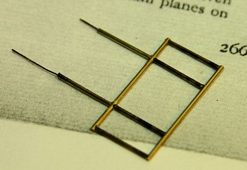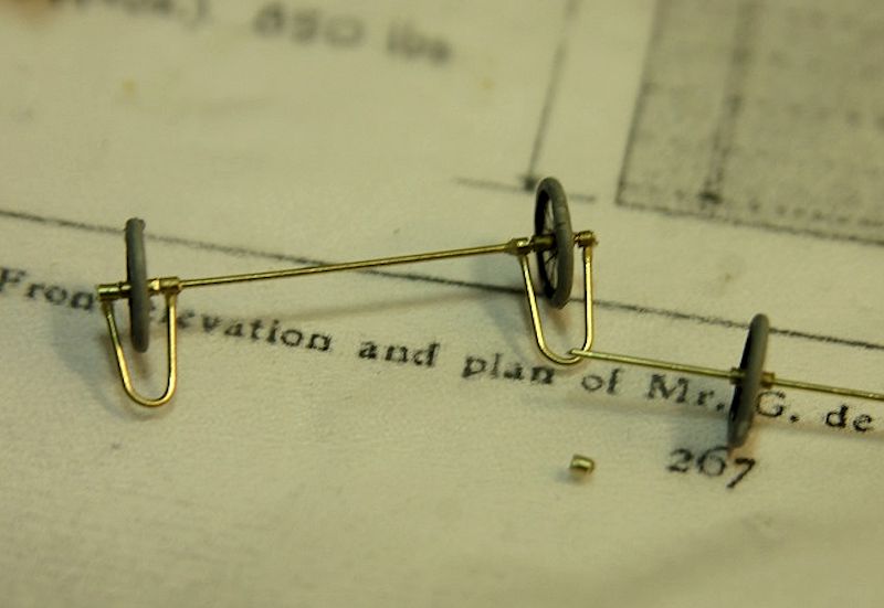 Die beiden Stützräder vorn und hinten waren wahrscheinlich starr angebracht. Deshalb wurden bei meinem Modell einfach entsprechende Messingröhrchen zurechtgeschnitten, zusammengesetzt und eingeleimt. Danach erhielten alle Fahrwerksstreben eine schwarze Bemalung. Wie aus dem Riss und meinem Bild ersichtlich, wurde die Verspannung aus transparentem Garn nachgebildet.