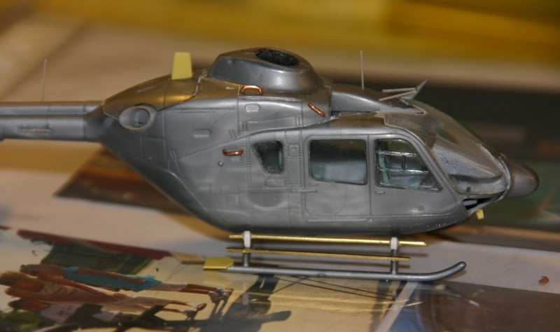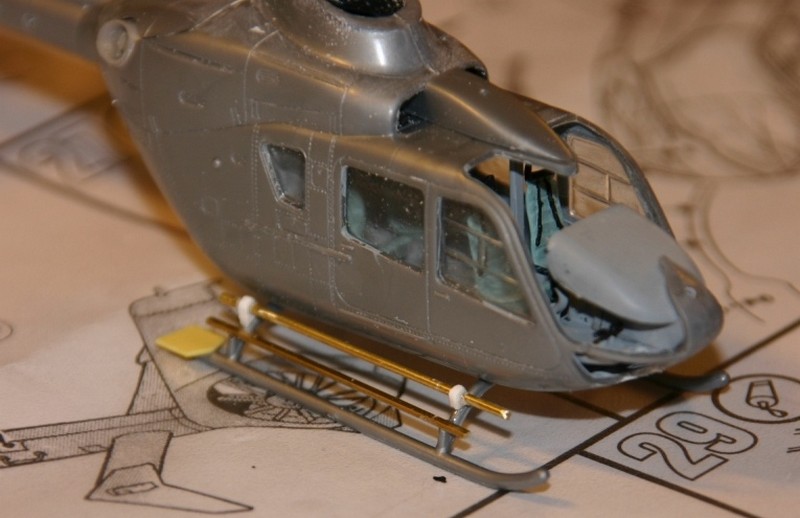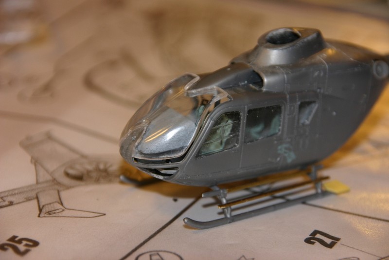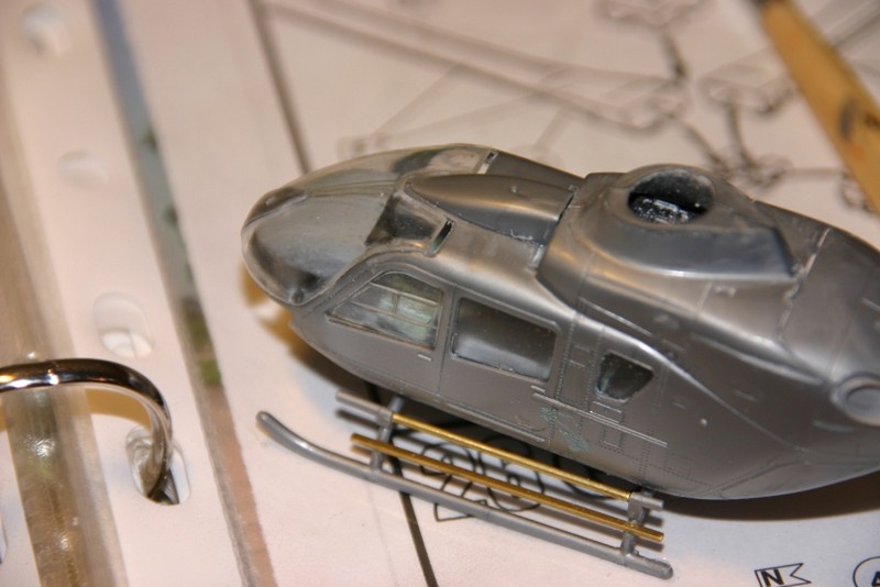 Ein wesentlicher Schwachpunkt ist eben jenes Kufengestell. Es ist schlichtweg falsch ausgeführt. Die obere Schiene hat nicht das dünne, geschwungene Dreikantprofil des Bausatzes sondern ein gerades Vierkantprofil. Darüber ist auf beiden Seiten noch eine runde Geräteträgerschiene angebracht. Im Bausatz liegt zwar eine solche für die linke Seite als nicht benötigtes Teil bei, aber Revell hat sich dabei mit der Stützweite der Befestigungen verhauen. Sie ist etwas zu kurz geraten. An der Kufe selbst ist noch eine kleine Leitwerksfläche, wie sie von der BK-117 bekannt ist, vorhanden. Im Bausatz fehlt diese. Also musste ich das Fahrgestell aus den Bausatzteilen, Messingstäben und etwas Platiksheed neu aufbauen.
