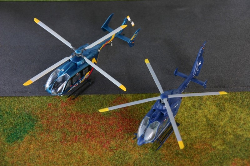 Nach Bemalung der Details habe ich den Hubschrauber in die Vitrine neben den EC 145 gestellt und einen Schreck bekommen. Auch wenn die Verwandtschaft mit dem deutlich größeren Nachfolger erkennbar ist, kann ich mir nicht vorstellen, dass der Rotor sich in die andere Richtung drehen soll. Vergleiche mit Bauanleitung und den selbst geschossenen Bildern zeigen, dass Revell hier ein kapitaler Fehler unterlaufen ist. Die Rotorblätter sind falsch herum gefertigt. Sie lassen sich auch nur in einer Stellung einbauen, da sie erstens Passstifte haben, und zweitens etwas durchhängend gestaltet wurden. Der Fehler liegt eindeutig bei Revell und lässt sich nur schwer ausbessern.