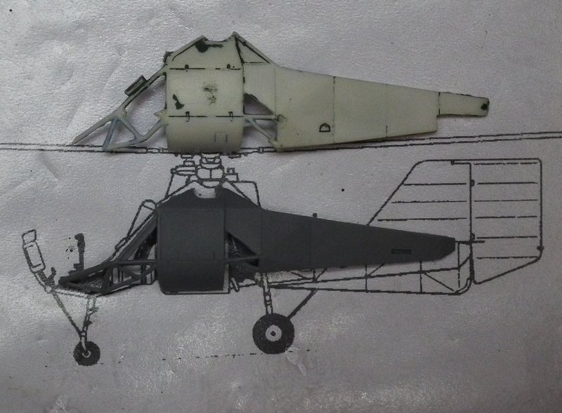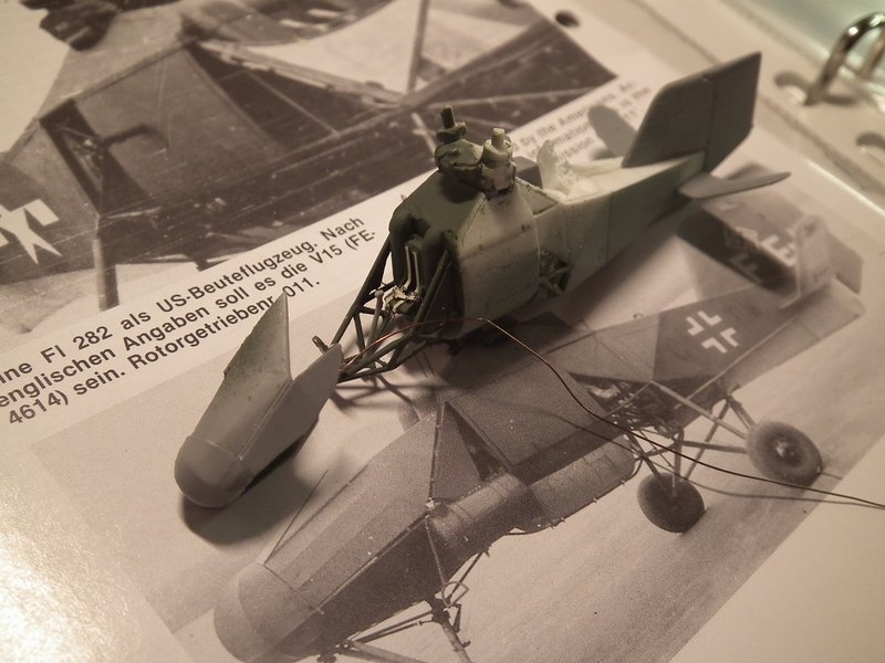 Als nun RS in Frühjahr seinen neuen Kolibri Fl. 282B-1 herausbrachte, habe ich mir auch einen dieser Bausätze zugelegt. Bevor ich den Huma-Bausatz wegwerfen wollte habe ich nochmals beide Bausätze verglichen. Dabei erlebte ich eine Überraschung. Der Kolibri von RS ist ca. 5 mm kürzer. Also habe ich mir einen Riss auf 1/72 gedruckt und verglichen. Dabei zeigte es sich deutlich, dass der RS-Kolibri etwas zu klein geraten ist. Da er jedoch besser detailliert ist, und mich diese Variante besonders beeindruckt, entschloss ich mich zu der Bauweise: "aus zwei mach eins". Der Rumpf kam von Huma.