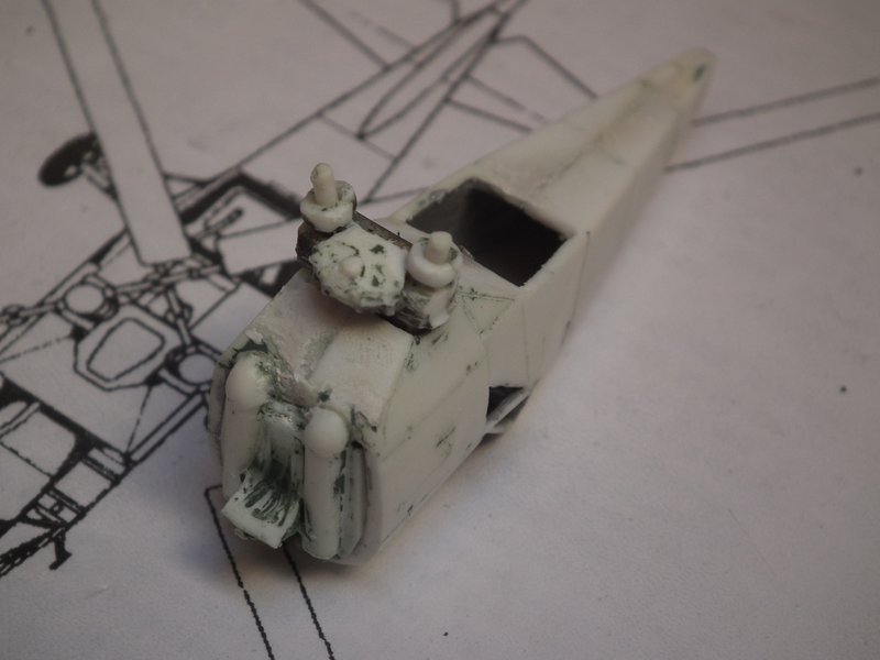 Die Passgenauigkeit der Rumpfhälften ist gut. Im Bereich vor dem Getriebe ist auch noch Platz für etwas Anglerblei. Komplettiert wurde der Rumpf mit Leitwerk und Bugverkleidung von RS. Auch der hintere Sitz und das Cockpit sind von dieser Firma. Wahrscheinlich ist mein Modell dadurch doch etwas kurz geraten, aber ich kann das nicht prüfen, da ich keinen Riss dieser Variante besitze.
