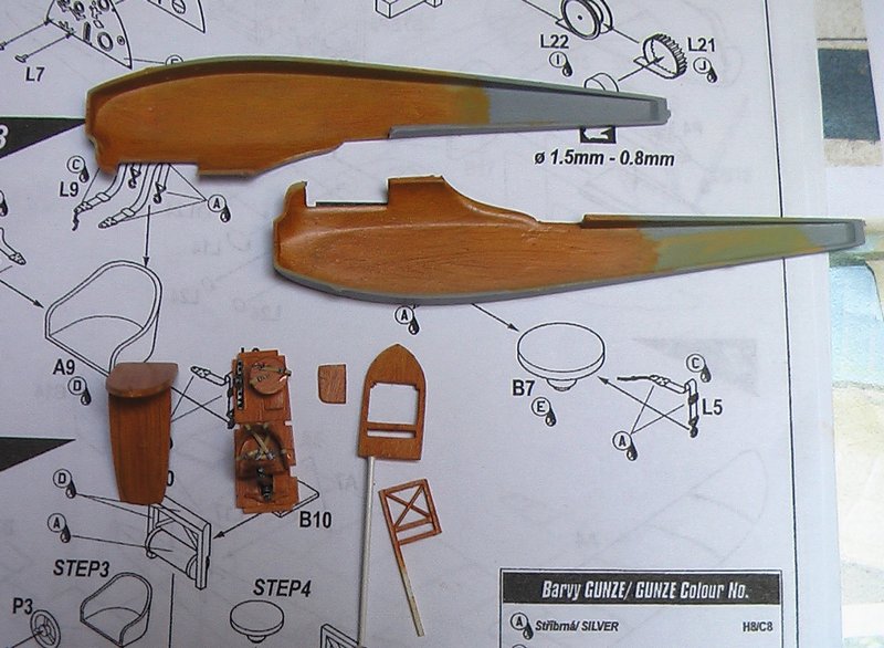 Bereits im Innenraum ist viel Holz nachzubilden. Ich habe mich entschlossen, erst einmal eine vereinfachte Variante zu versuchen. Die Teile wurden hautfarbig (Tamya XF15) gespritzt. Danach habe ich mit einem dunkelbraunen Buntstift eine Art Holzmaserung aufgemalt.