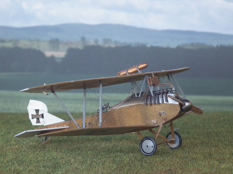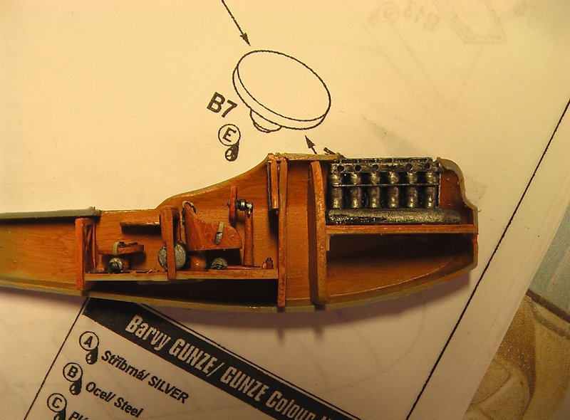 Die Montage von Fahrwerk und Kühler sowie ihre Bemalung geht schnell von statten. Da ich allerdings die vordere Motorabdeckung gekürzt habe, musste ich am Motor ein beim Original vorhandenes Rohr (Kühlwasser?) ergänzen.