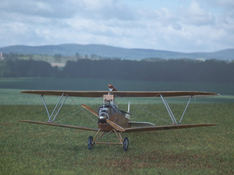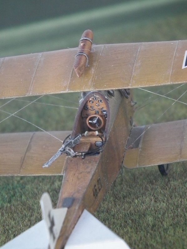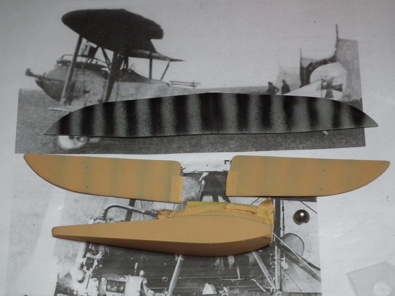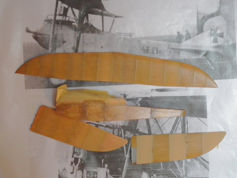 Leider konnte ich nicht ermitteln, ob die Maserung längs oder quer zur Tragfläche erfolgte. Ich habe mich einfach für quer entschieden. Es wurde immer etwas anders angemischte Ölfarbe von der Palette aufgetragen. Das Ergebnis halte ich für relativ genau dem Original entsprechend, wo astfreies, feingemasertes Sperrholz zum Einsatz kam. Am Rumpf habe ich nach der Grundierung mit Hautfarbe und Betonung der Stöße erst Abziehbilder der Firma Uschi van Rosten eingesetzt. Diese bringen eine stärkere Holzmaserung auf. Danach erfolgte die gleiche Bemalung mit Ölfarbe. Die Teile am Rumpf sind eigentlich zu stark gemasert, machen aber rein optisch einen besseren Eindruck.
