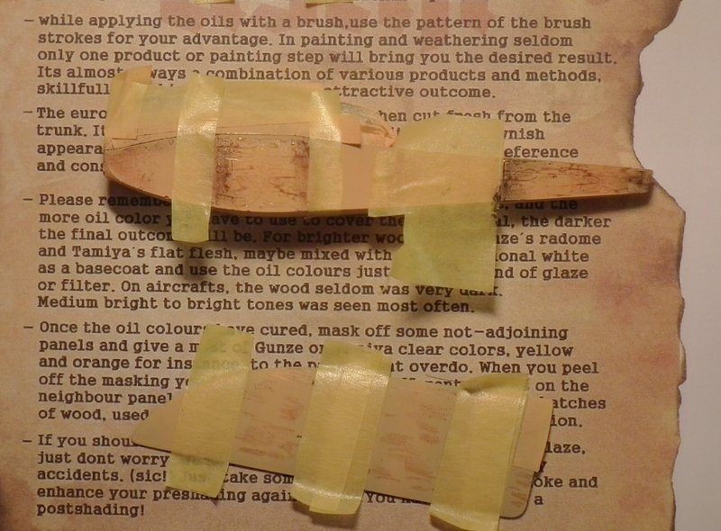 Nach der Maskierung der Silberteile erfolgte die Nachbildung von Holz auf Rumpf und Tragflächen. Dabei habe ich unterschiedliche Verfahren angewendet. Die Tragflächen wurden wie der Innenraum, aber ohne die Buntstiftbehandlung grundiert. Danach erfolgte eine Abschattung der Stöße mit dunkelbrauner Acrylfarbe (Tamya). Beim Auftrag der Deckfarbe habe ich abschnittsweise gearbeitet. Unten wurde der nächste Bereich maskiert und oben das bereits gestrichene Segment mit einem Papierstreifen zugehalten.