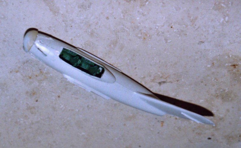 Nach Bemalung der Innenteile konnte der Rumpf zusammengesetzt werden, was aufgrund der verzogenen Rumpfhälften nicht ganz einfach war. Durch den Einsatz von extra viel Klebstoff konnte ich mir die Spachtelarbeit sparen, jedoch hat die Oberflächengestaltung durch die Schleifarbeiten gelitten, und bei genauer Betrachtung ist erkennbar, dass der Rumpf etwas unrund ist. Wer den Rumpf rund haben möchte, oder Wert auf eine negative Gravur legt, muss die gesamte Oberfläche begradigend abschleifen.