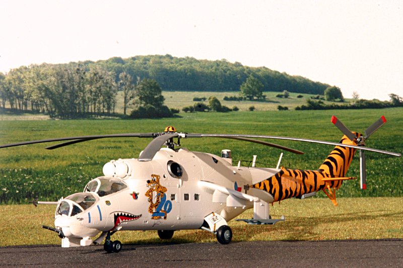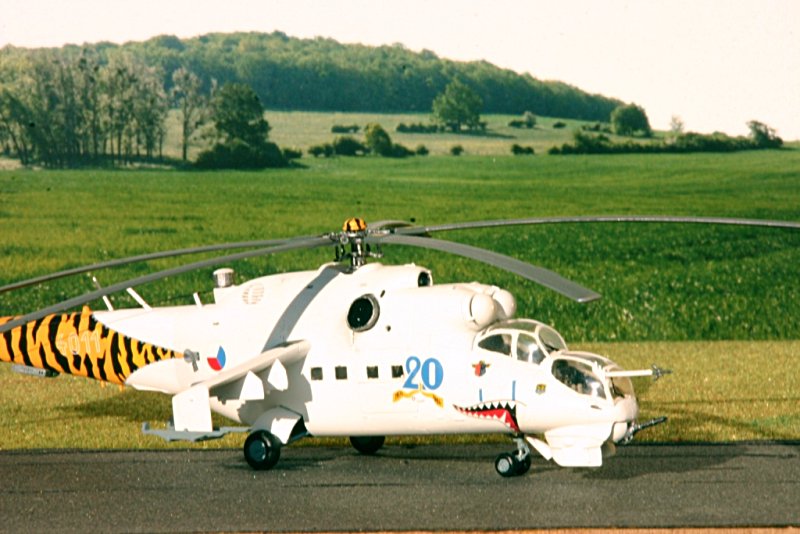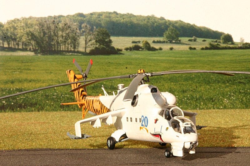 Schon längere Zeit trage ich den Gedanken vor mir her, verschiedene Versionen der Mi-24 zu bauen. Deshalb habe ich mir die Mi- 24 Hind A und E von Hasegawa und den älteren Bausatz der Mi-24D mit Sonderbemalung Tigermeet von Revell zugelegt. Der Vergleich der Spritzlinge zeigte, dass der Revell- Bausatz erhebliche Schwächen hat. Insbesondere sind der Kabinenübergang und die Seitenflosse falsch dargestellt, der Rotorkopf ohne Ähnlichkeit mit irgendeiner Mi- 24- Variante und die PALR- Raketenbehälter zu dünn geraten. Da die Mi-24D von Hasegawa aber nicht zu bekommen war, habe ich mir einen 2. Bausatz der E-Variante von Hasegawa zugelegt. Dieser beinhaltet alle Bauteile für eine Mi-24D, lediglich die Bauanleitung und die Abziehbilder stimmen dann nicht.