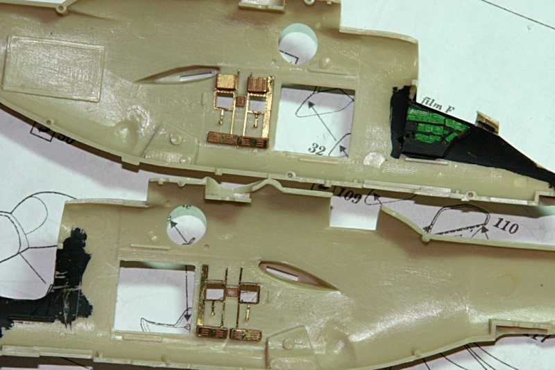 Eduard gibt an, die Türen aus dem Klarsichtteil der Kabine zu entfernen. Das ist eine heikle Angelegenheit, wobei noch das vordere, heraus getrennte Teil als offener Einstieg angesetzt werden soll. Bei der Revell- Haube sind die Türen bereits ausgeschnitten, aber aufgrund der fehlerhaften Kontur passt dieses Teil leider nicht auf den richtig geformten Hasegawa- Rumpf. Deshalb habe ich die hintere Tür aus dem Bausatzteil ausgesägt. Für eine neue gibt es eine sehr schöne Lösung aus dem Ätzteilsatz. Die Tür des Waffenoffiziers blieb geschlossen.