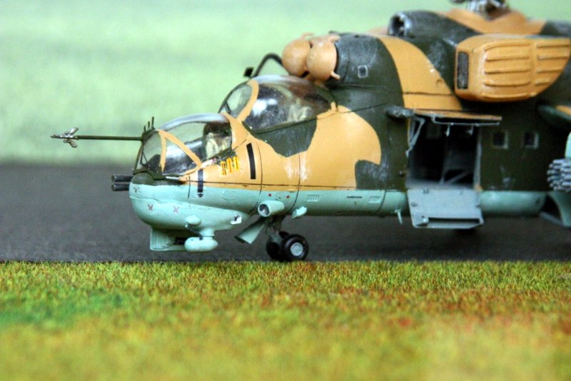 Zuletzt erhielten die Blechstöße noch ein leichtes Washing und die Mi-24 wurde mit Ölfarbe trockengebürstet. Die Außenlasten wurden angebracht, die Kabinentüren montiert und einige Kleinteile ergänzt. Die Spitze des Staurohres entstammt dem Revell- Bausatz.