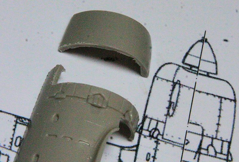 Die Resinteile für die Seitenwände im Cockpit passen ausgezeichnet. Leider kann man das für das Armaturenbrett nicht sagen. Offensichtlich wurde die dicke Wandung des Bausatzes nicht berücksichtigt. Ausschleifen der Seitenwände erschien mir zu aufwändig und das Risiko eines Wanddurchbruches zu hoch. Deshalb habe ich das Armaturenbrett etwas beschnitten wobei allerdings rechts und links das randseitige Instrument verschwand.