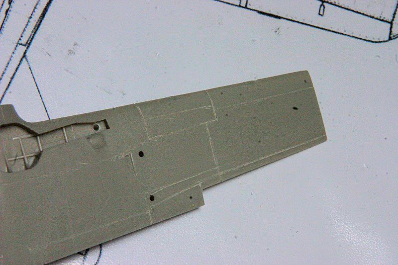 Danach wurde der Einbau der Landeklappen vorbereitet. Leider sind die Ruder am Bausatz in einem Stück. Es muss jedoch das obere Blech erhalten bleiben. Da es mir zu schwierig schien, nur die Unterseite abzuschleifen habe ich die Klappe im Ganzen entfernt. Danach erfolgte der Einbau einer dünnen Plastikplatte als neues Abdeckblech. Der Rand wurde noch etwas ausgedünnt.
