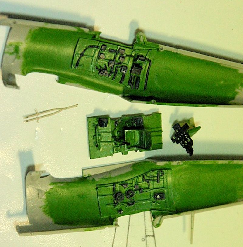 Lackiert wurde der Innenbereich mit hellgrün und schwarz. Zur besseren Hervorhebung der Details habe ich ihn mit weißer Ölfarbe trockengebürstet. Ergänzend kam noch ein Satz Gurte von Eduard hinzu.