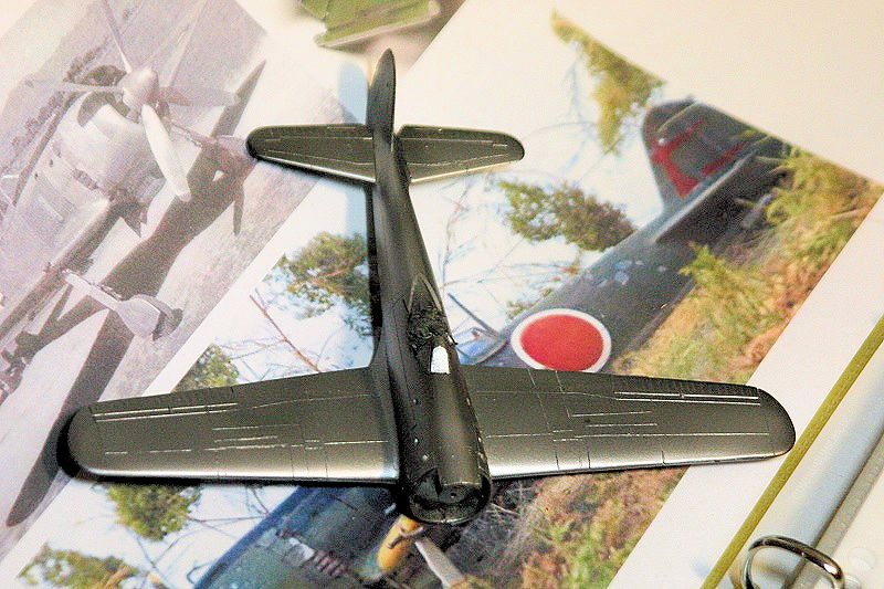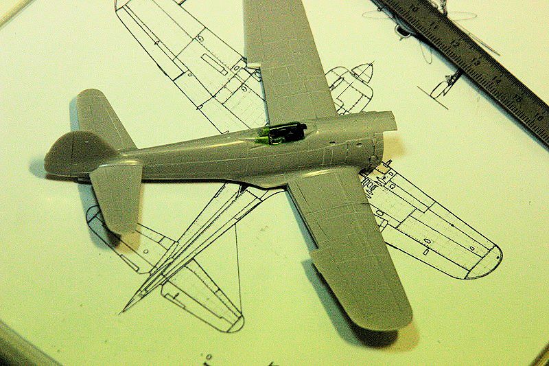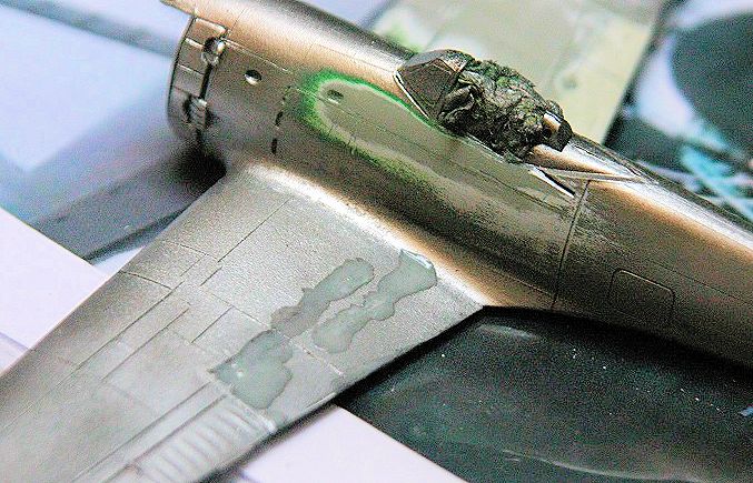 Im nächsten Schritt wurde das Modell grundiert. Dazu habe ich zuerst die vordere Kabinenhaube angebracht und den Cockpitbereich maskiert. Nach Farbauftrag zeigten sich noch einige Fehlstellen die verspachtelt oder nachgraviert werden mussten.