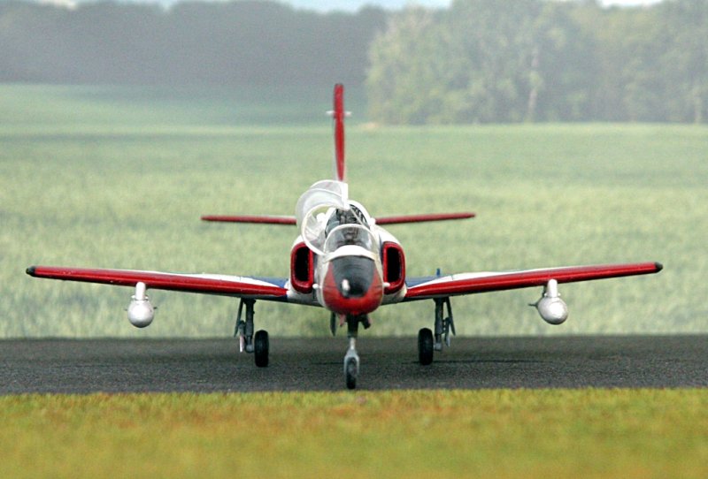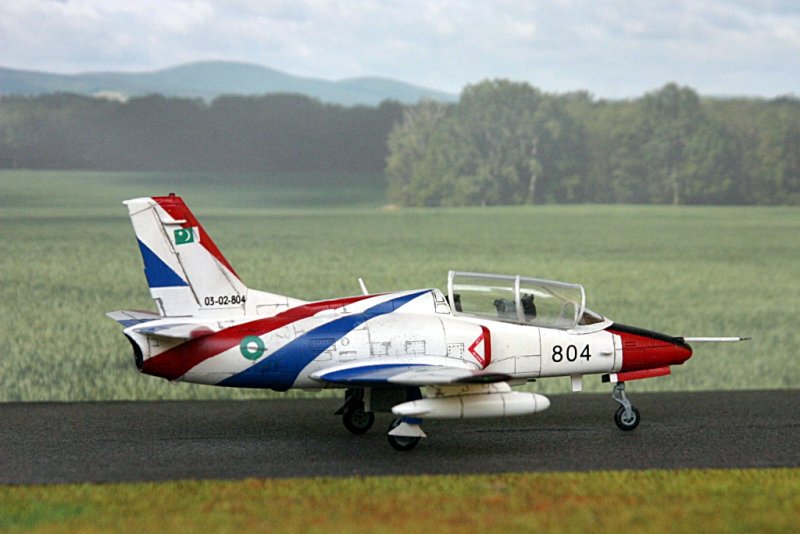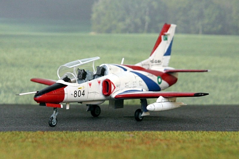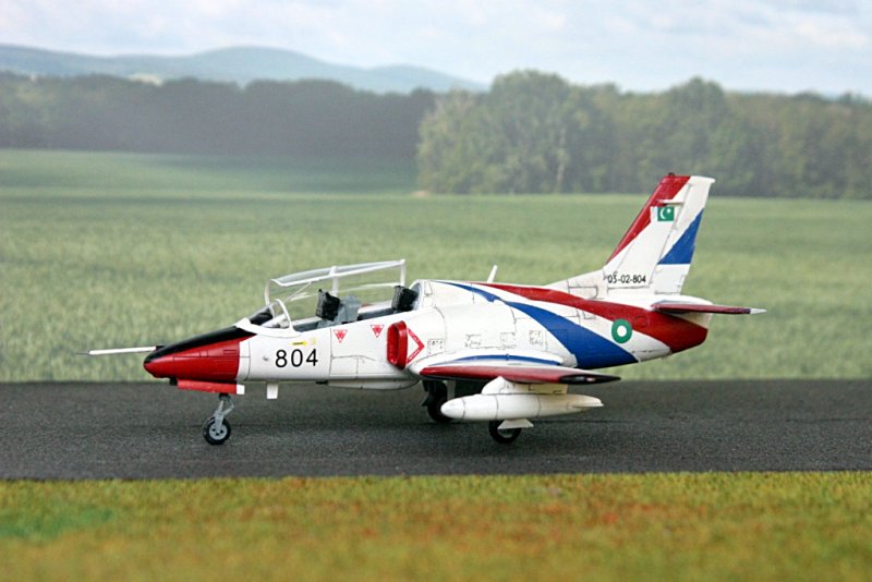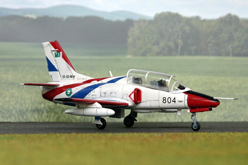 Ich habe mich für die Gestaltung einer pakistanischen K-8 entschieden Die Lackierung erfolgte in mehreren Stufen über blau und rot zu weiß. Zur Vorlage der Masken für die blauen Bereiche konnten die Abziehbilder dienen. Rote Decals sind auf dem Bogen leider nicht vorhanden. Hier ist die Bemalfreude des Modellbauers gefragt. Aufgrund der besseren Deckkraft und Haftung habe ich mit Revell- Lacken gespritzt.