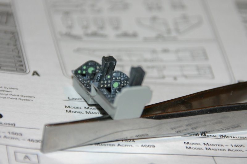Das Armaturenbrett des Ätzteilsatzes ist für den Bausatz etwas zu groß geraten. Bei den Anpassarbeiten sind leider zwei kleine Stellhebel davongeflogen und auf nimmer wieder sehen verschwunden. Gleiches gilt auch für den Abzugsgriff des Schleudersitzes.